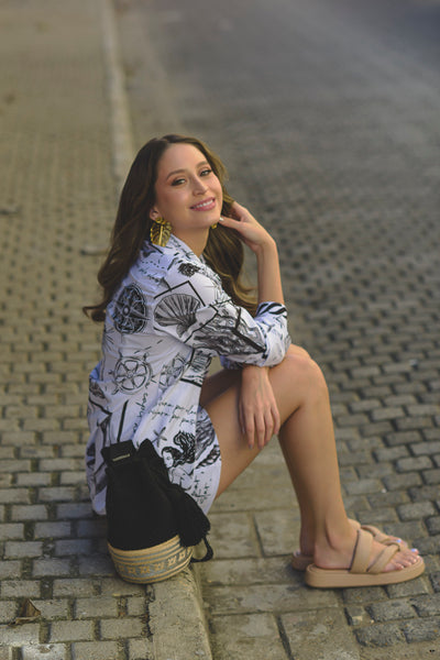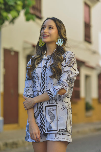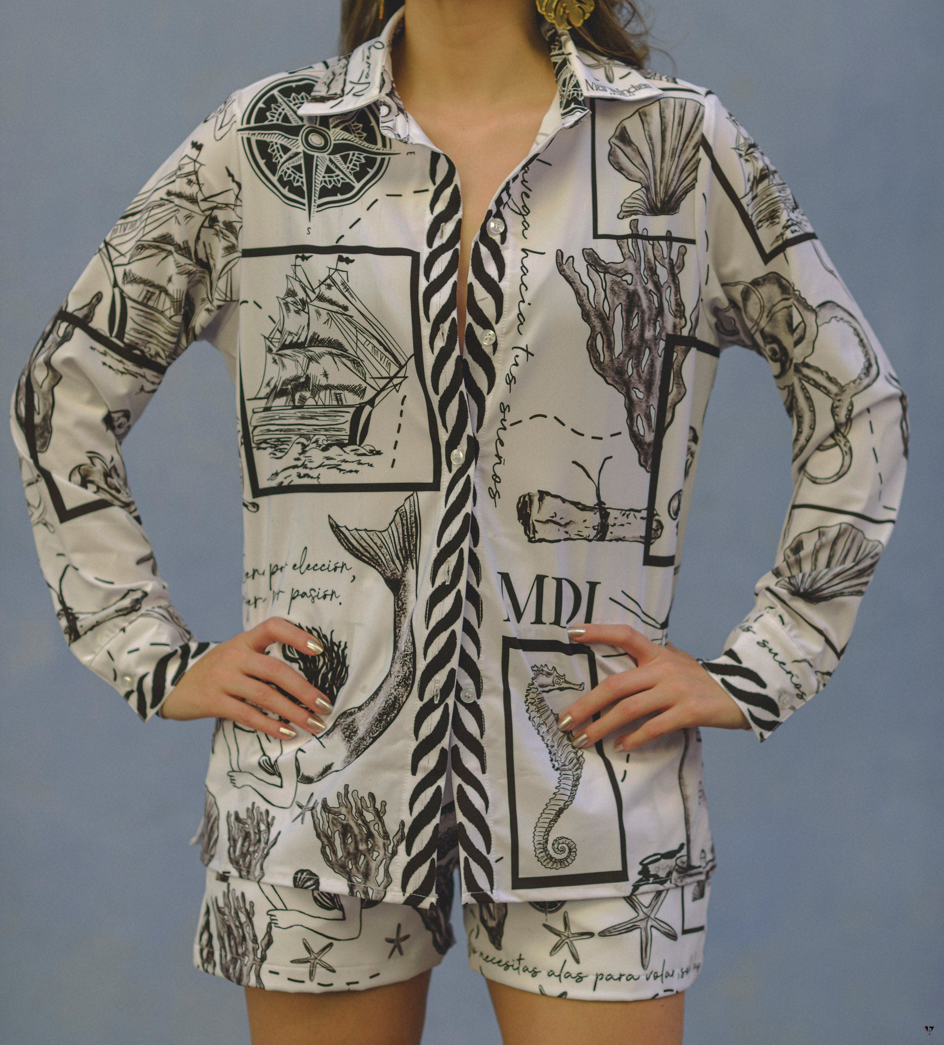 Explore the essence of the ocean with our "Mar de Indias" Set, the gem of our New Collection. This shirt and shorts ensemble is more than just an outfit; it's a declaration of our love for the sea, manifested in an exclusive print that embellishes every inch. Special Features: ☆ Exclusive Print: This special design stands out with an exclusive print that illustrates our deep connection and love for the sea. Every detail tells a story, making this set the heart of the entire collection. ☆ Long Sleeve Shirt: The long sleeve shirt adds a touch of elegance and versatility to your attire. Ideal for any season, this garment perfectly represents the freshness of the ocean. ☆ Shorts with Pockets: In addition to being part of this thematic set, the shorts provide comfort and functionality with practical pockets. Perfect for carrying your essentials while enjoying a day under the sun. ☆ Model is wearing size S.