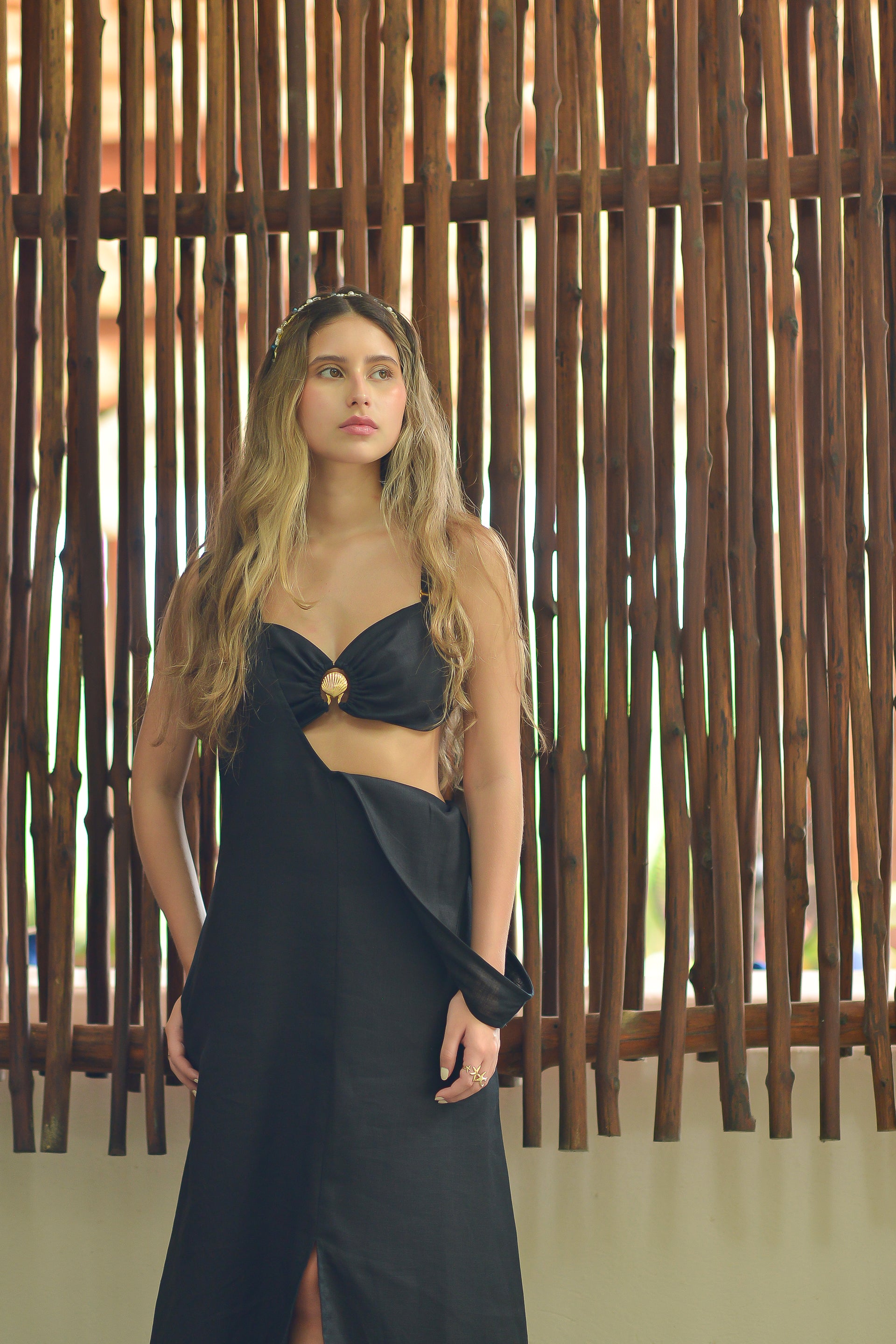 Este vestido largo en lino color negro incluye dos piezas: el vestido y un top adicional. El top está adornado con un hermoso herraje en forma de concha de mar en tono dorado, agregando un toque especial y elegante. El vestido cuenta con prácticos bolsillos internos y delicadas aberturas en la parte delantera y trasera, que permiten un sutil vistazo al top, creando un look moderno y versátil. Ideal para cualquier ocasión donde quieras destacar con estilo. ☆ También disponible con color camel. ☆Tipo de textil: Lino 100% ☆ La modelo utiliza talla XS. ☆Accesorios no incluidos. ☆ Hecho por mujeres colombianas.